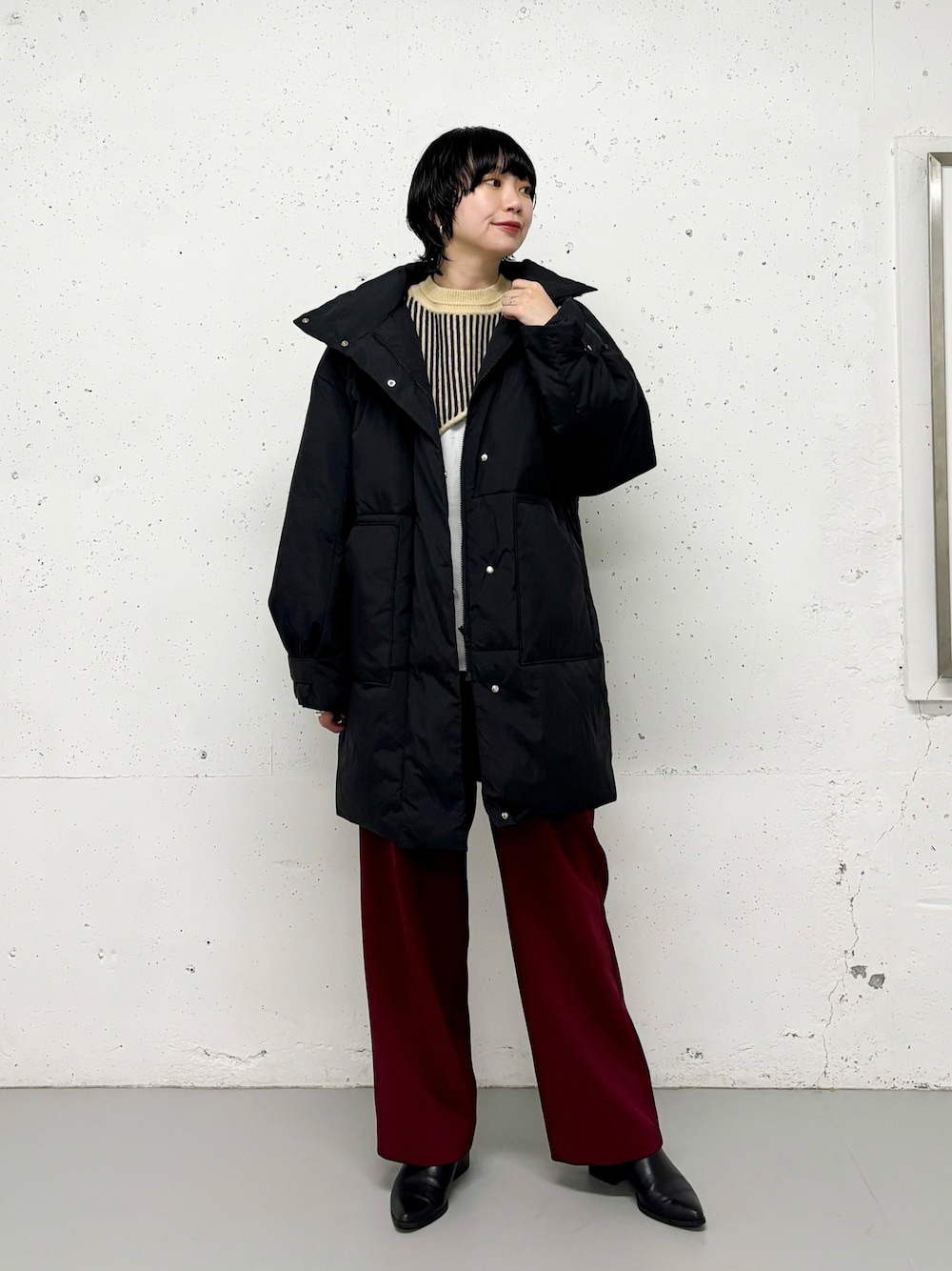 ショート丈のベストがセットになったダウン。 個人的には、ベストを中に着るのがおすすめ! 見え方が変わって良い感じです。 トレンドのクロップド丈のニットはシンプルなブラウスとレイヤードで。 パンツ、シューズは私物です。