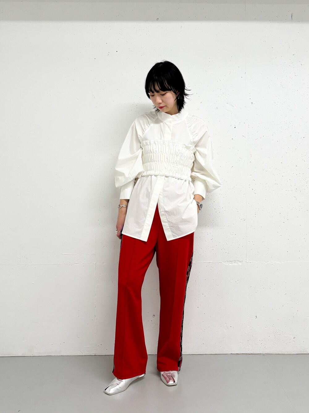 ビスチェを付ける位置や、シャツが前後で着れたりとアレンジ自在のトップス。 セットで着用するだけでおしゃれ見えします◎ KBFおすすめのデザインデニムを合わせるのも良いですが、今回はトラックパンツで。 再度のブレードラインがとっても可愛いです!
