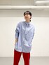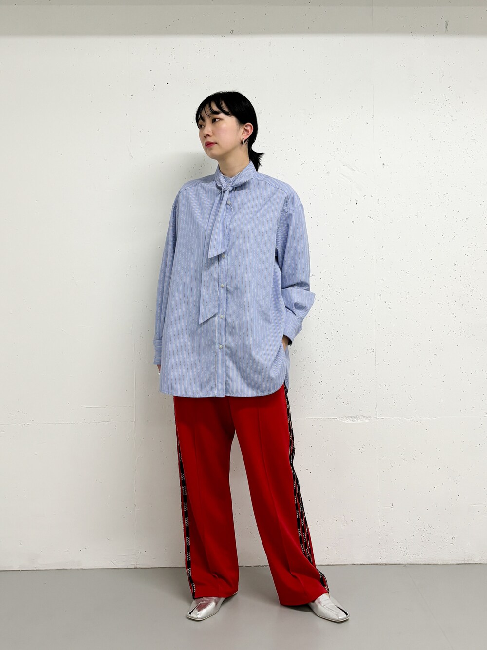 きれいめな印象のボウタイシャツに カジュアルなトラックパンツを合わせてみました。 イメージが真逆のアイテムを組み合わせるのって楽しいです◎ ボウタイは写真のような片輪結びや、 ラフにネクタイを巻いたように仕上げるのがKBFのおすすめです!