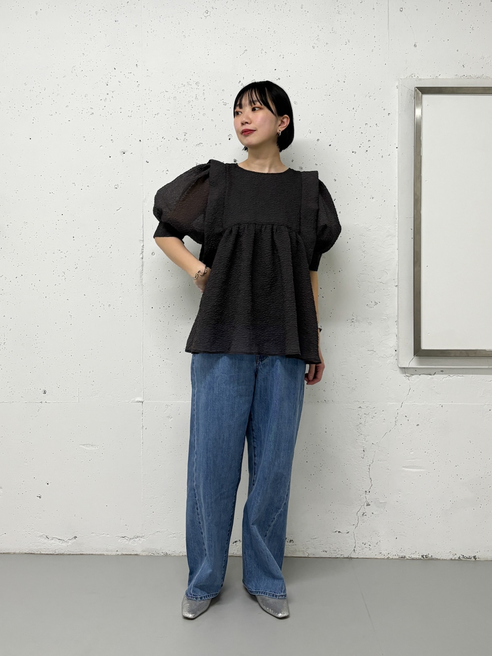独特の素材感が可愛い着映えブラウス。 甘過ぎないデザインなのでカジュアル派の方にもおすすめの1着。 シワが気になりにくいのでデイリーユースにぴったり! デニムとの相性もばっちりです◎