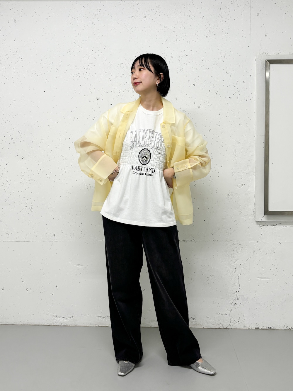 スタイルアップが期待できるシャーリングのTシャツに ブラックデニムを合わせたモノトーンコーデ。 何かを足したくて、シアーシャツを羽織ってみました。 カジュアルさを程良く抑えられて◎