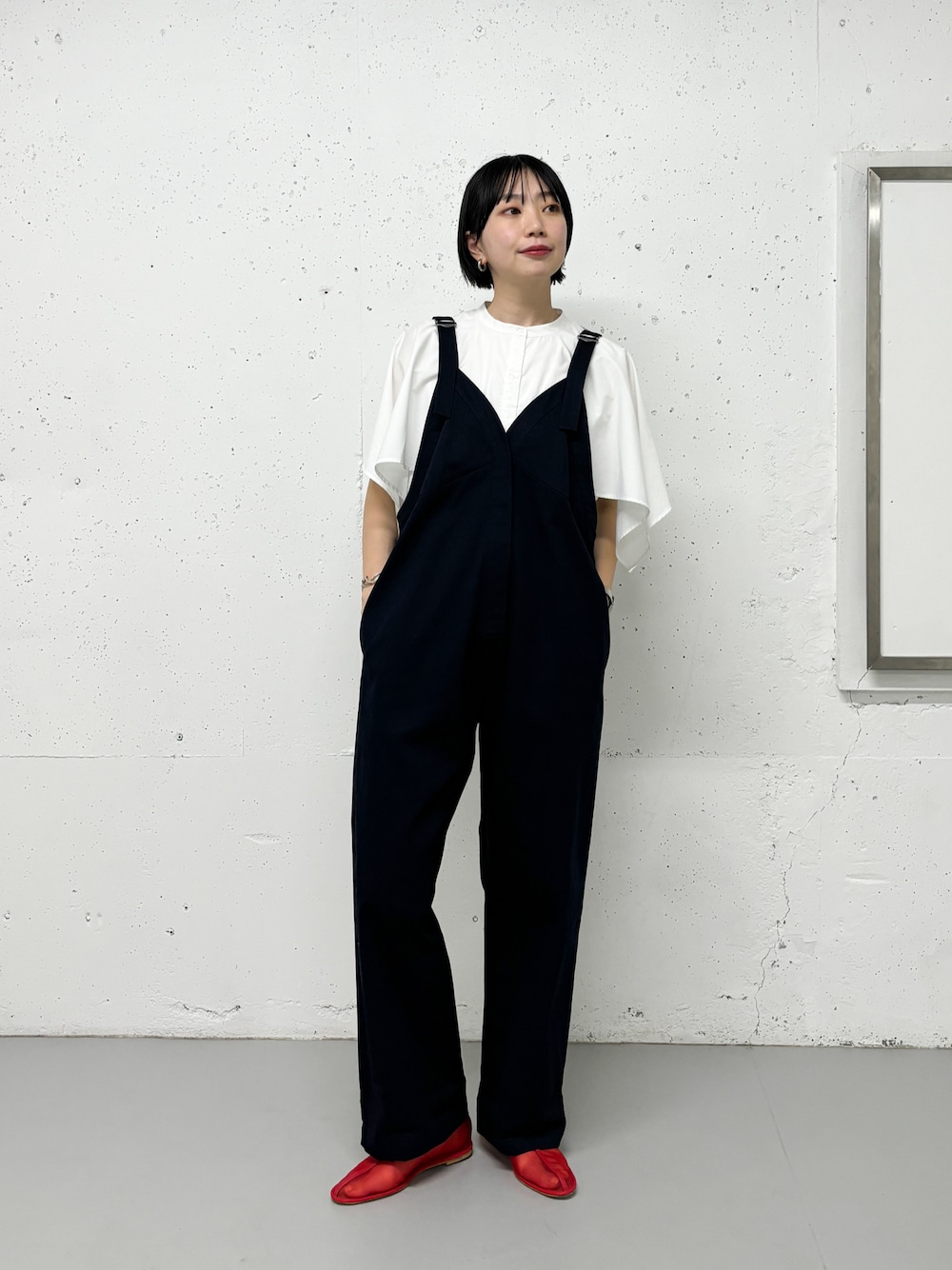 KBFの夏の定番アイテムになりつつある2WAYマントブラウスは サロペットのインナーにも最適! 袖にあるボタンの留め方を工夫すると、後ろ姿に変化が出て◎ (3枚目と4枚目の写真です) こちらのサロペットは2サイズ展開&アジャスター付きなので 高身長さんにもおすすめです!