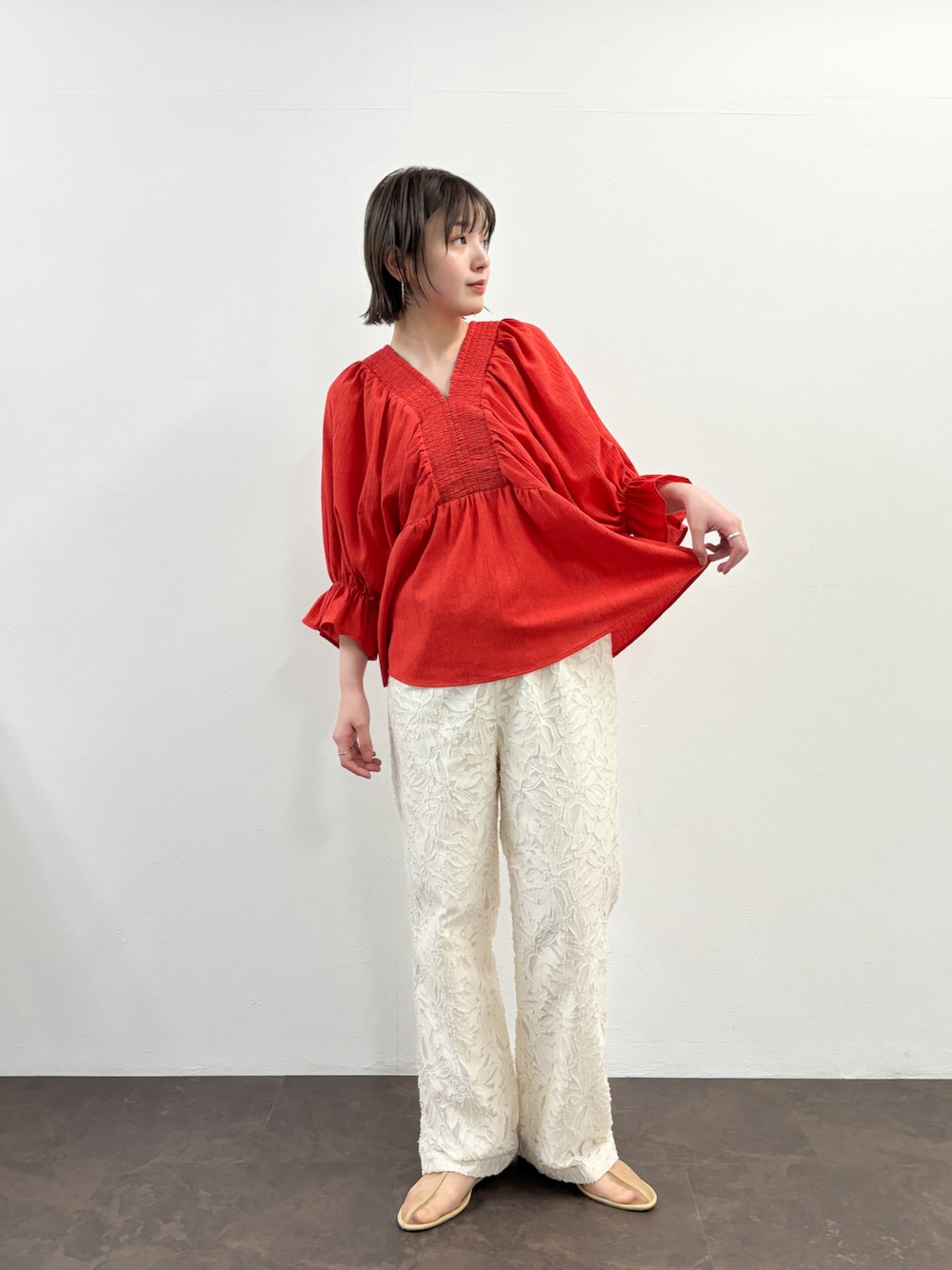 レッドが映えるブラウスを主役にしたコーディネートです! レースのパンツで女性らしく柔らかい印象に◎ ヒップにかかる丈なので、ボトムのシルエットを選ばなくてオススメです^^