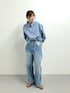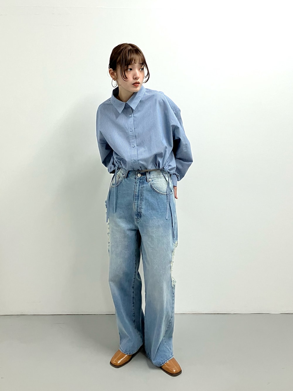 身長:160cm 裾のドロストでシルエットの変化を楽しめるシャツでコーディネートしました! シワが気になりにくい素材なので羽織でも着れそうです◎ ストライプが細めで着回しやすいカラーシャツ、 今回はデニムとトーンを合わせたカジュアルなワントーンコーデに^^