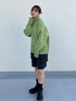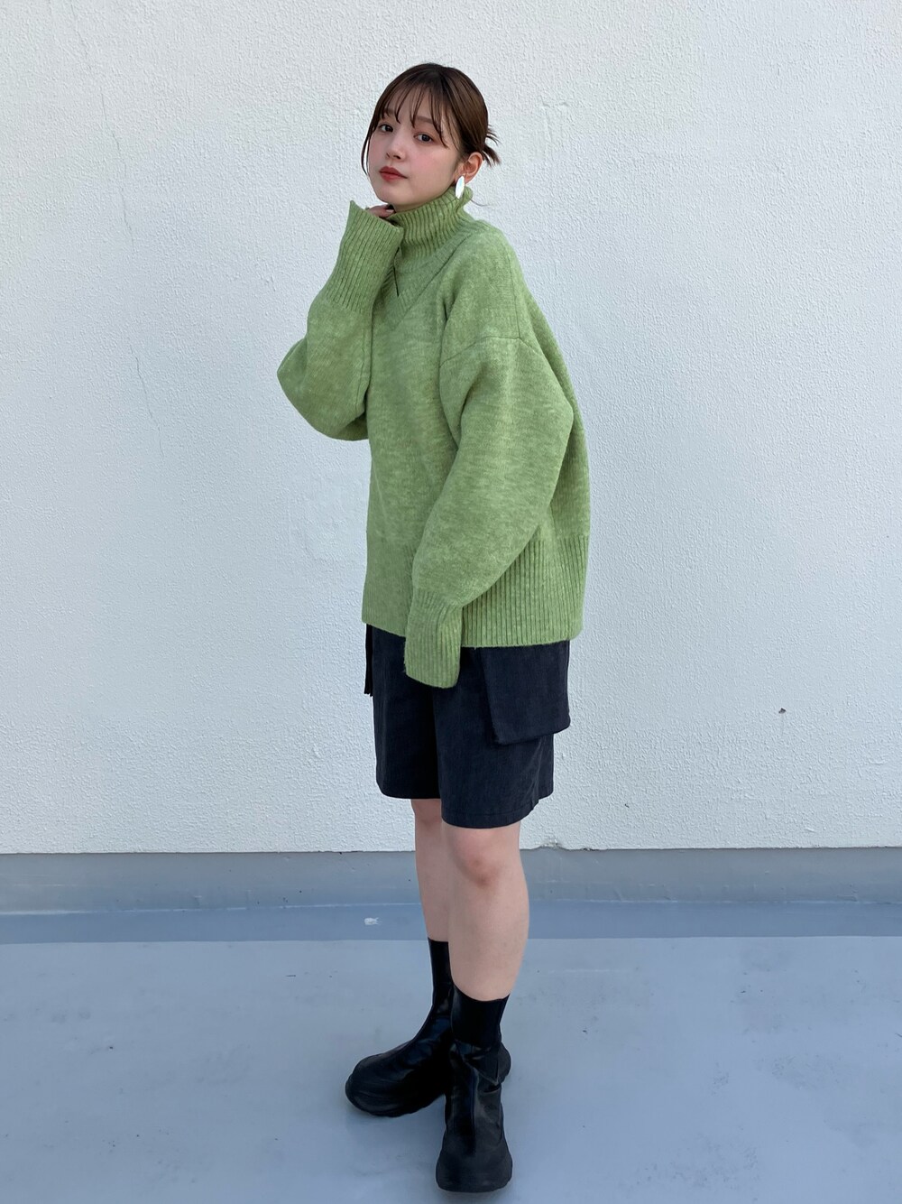 身長:160cm 華やかなグリーンのニットを主役にコーディネート! ヒップにかかるゆるっとした丈感なので、 ショートパンツにブーツで合わせました👢 袖のスリットがデザインポイントになってるので、 コートの袖からチラッとさせたいです🎶