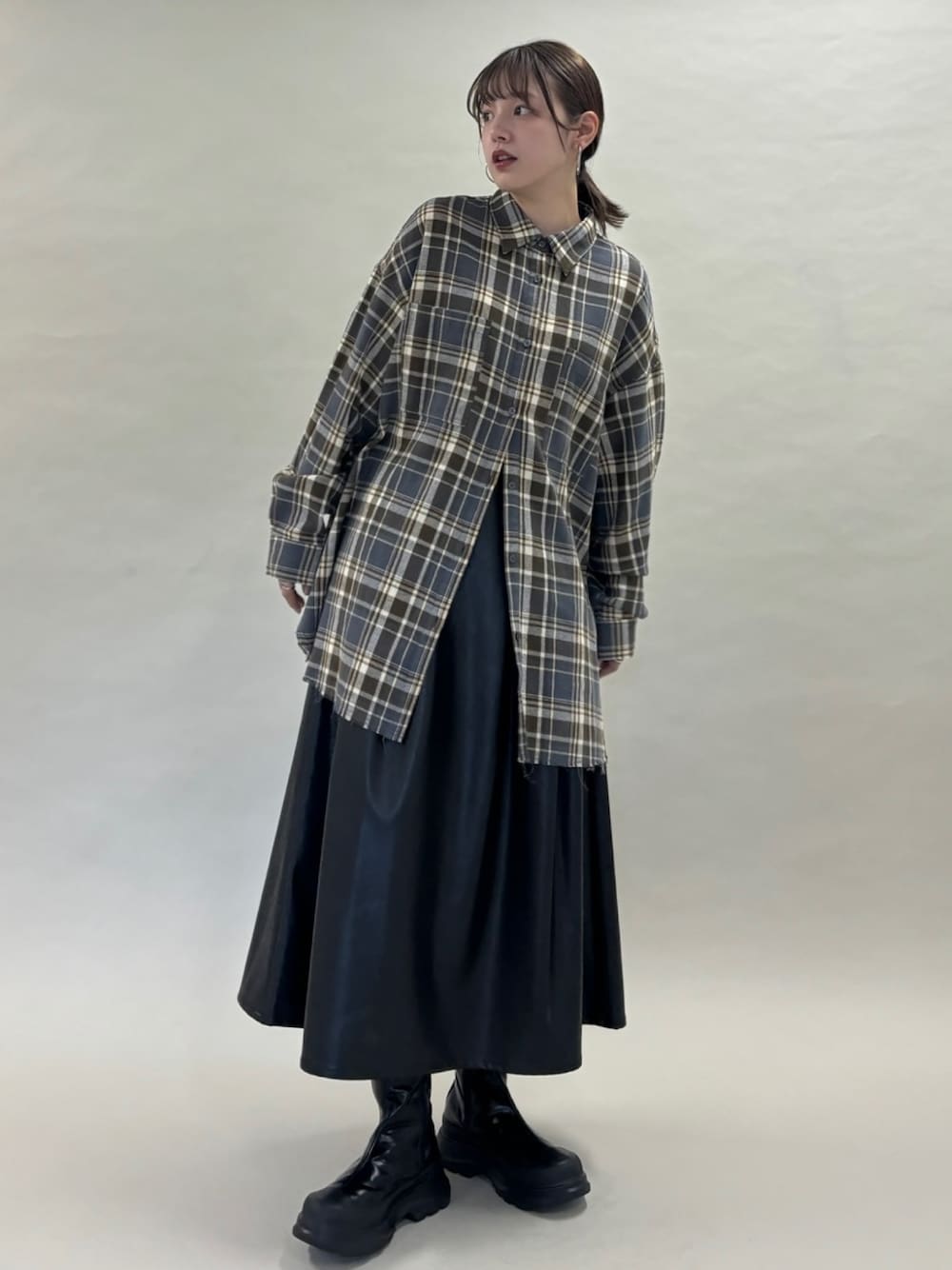 身長:160cm ヴィンテージライクなチェックシャツを レザーで辛口コーデに👢 トレンドのチェックシャツですが、 こちらはKBFのオリジナル柄なんです❗️ 太ももにかかるゆったりサイズのシャツなので、 今年らしくベストやスウェットとレイヤードするのもアリ🐜❤️