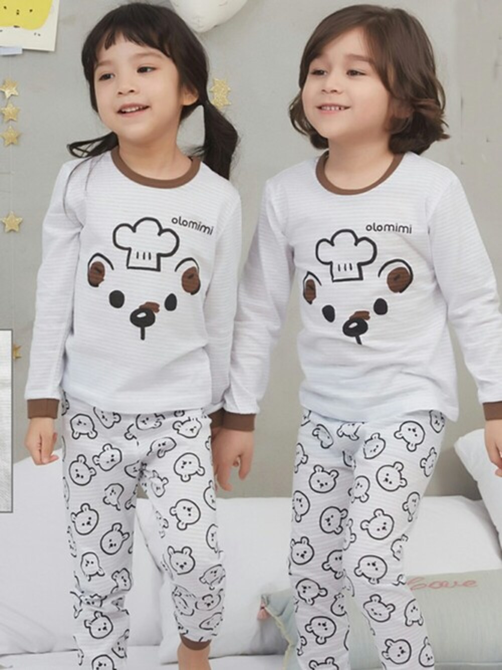パッと目を引くコックなクマさんの お顔がとびきりキュート♡ 今の季節に嬉しい長袖の薄手コットンパジャマが登場中!! 上下で柄の違うミックスマッチパジャマは シンプルだけど存在感抜群のクマさんフェイスのトップスに、 ズボンがクマさん総柄のメリハリのあるデザイン♡ 男の子でも女の子でも楽しめるデザインだから 兄妹やお友達とお揃いで着られちゃう♡ ふんわり優しい肌さわりで、寝心地も抜群です♡