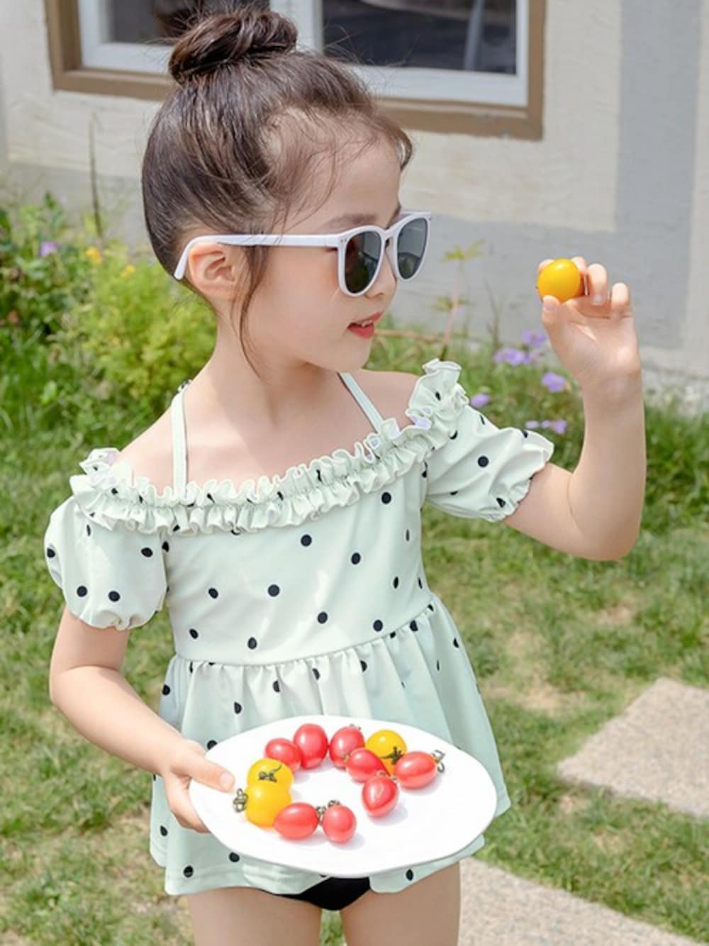 KidsTeddy(TeddyShop)の水着「キッズ水着 フリルオフショルダーペプラムセパレートビキニ+キャップ 上下3点セット」を使ったコーディネート