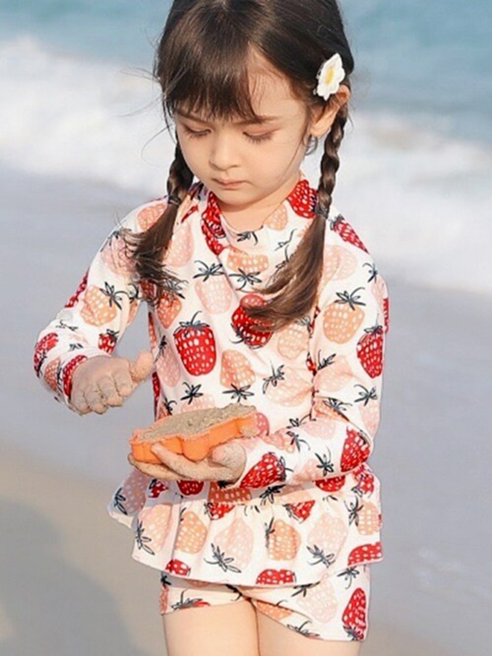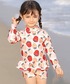 KidsTeddy(TeddyShop)の水着「【UPF50+/ビキニ3点セット/キッズ水着】長袖ハイネックフリルストロベリートップス+パンツ+スイムキャップ」を使ったコーディネート