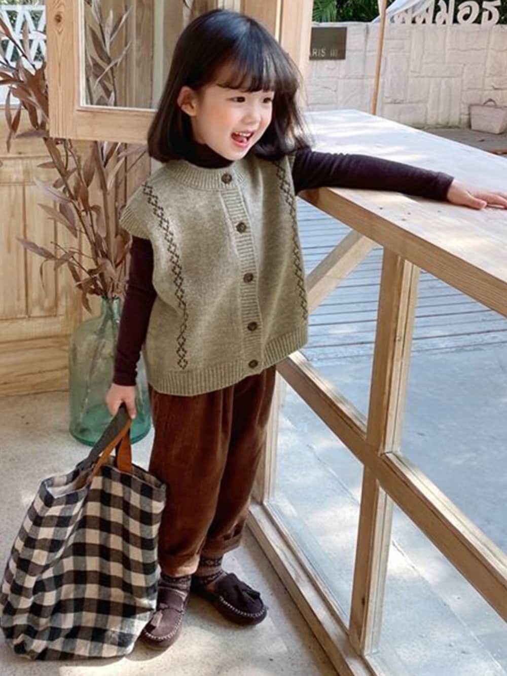 KidsTeddy(TeddyShop)のベスト「ツートンカラーリブ襟ナチュラルrテイストニットベスト キッズ」を使ったコーディネート