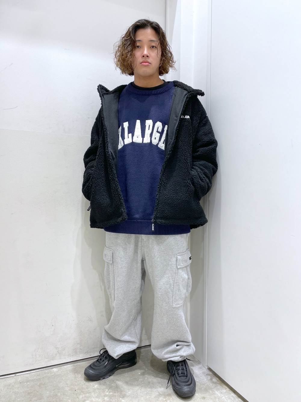 カレッジロゴのニットを使用した冬コーディネートです。 ニットのリブがゆったりとしているので春先でも使用しやすいです!