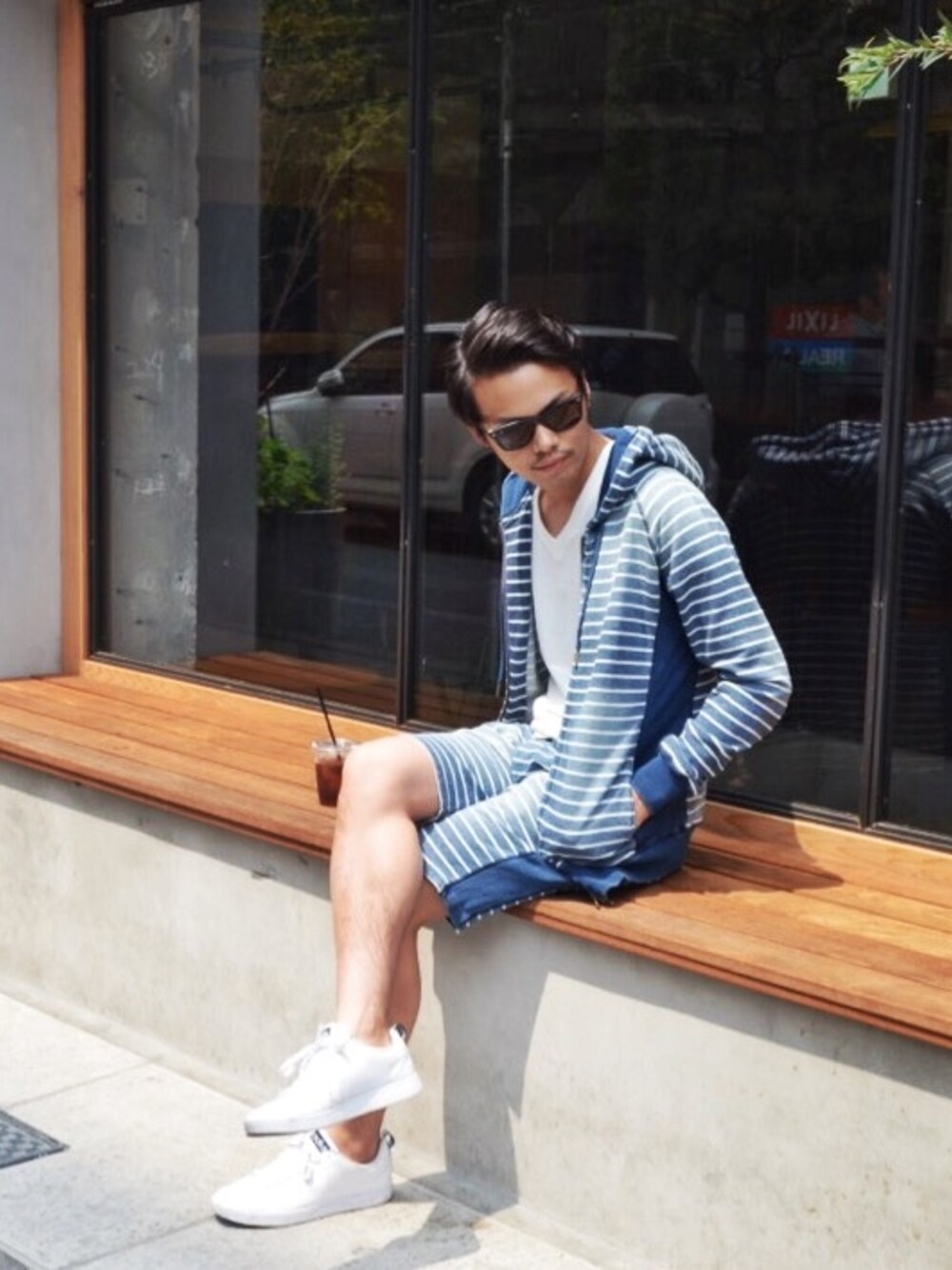 KOHEI SASANOのパーカー「1PIU1UGUALE3 RELAX(ウノピゥウノウグァーレトレ)インディゴボーダー フードパーカ」を使ったコーディネート