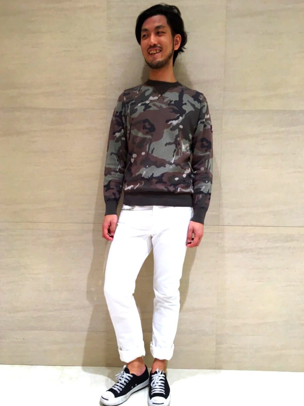 春らしく爽やかなコーディネートになりました。 インディゴデニムが多いのでホワイトデニムでいつもと違った雰囲気に。 トップスのプルオーバーで大人っぽく。