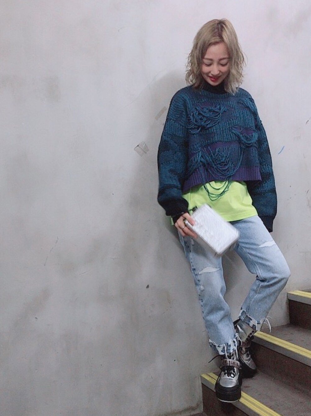 冬だからこそカラーで遊ぼう\( ˙▿˙ )/💗 グリーンと紫のマーブルニットにネオンカラーのイエローを挟んでみました✨ 太すぎず、細すぎずなストレートのデニムでnylon風に( ´ᐞ` )🌟