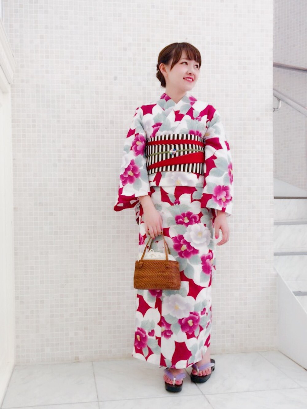 ローズピンクに大柄の椿が可愛い浴衣🎐 周りと差がつく柄の帯がお気に入り♡