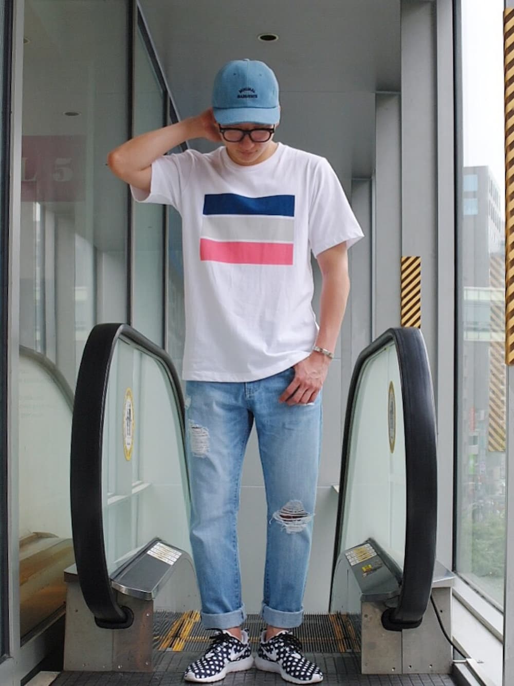 LIFUL 2015 "Break Time" Collection STAFF DAILYLOOK. CAP - ARCH LOGO 6PANEL CAP denim TOP - FLAG TEE BOTTOM - NEW STANDARD DENIM PANTS damaged www.liful.co.kr