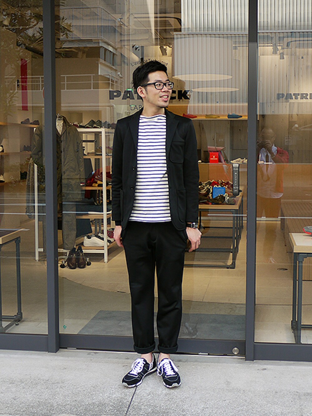 前回に引続き、 "セットアップ" !! 今回はカラー違いのブラックのモノトーンコーデに。 足元は新作の「KINGBIRD+」のブラック。 以前にもご紹介した「KINGCRAFT(キングクラフト)」の兄弟モデルで、 KINGCRAFTは "ヌバック素材" を使用した高級感ある一足でしたが、 今回のモデルは、"ナイロン×ベロア" を使ったカジュアルテイストな一足に仕上がっております。