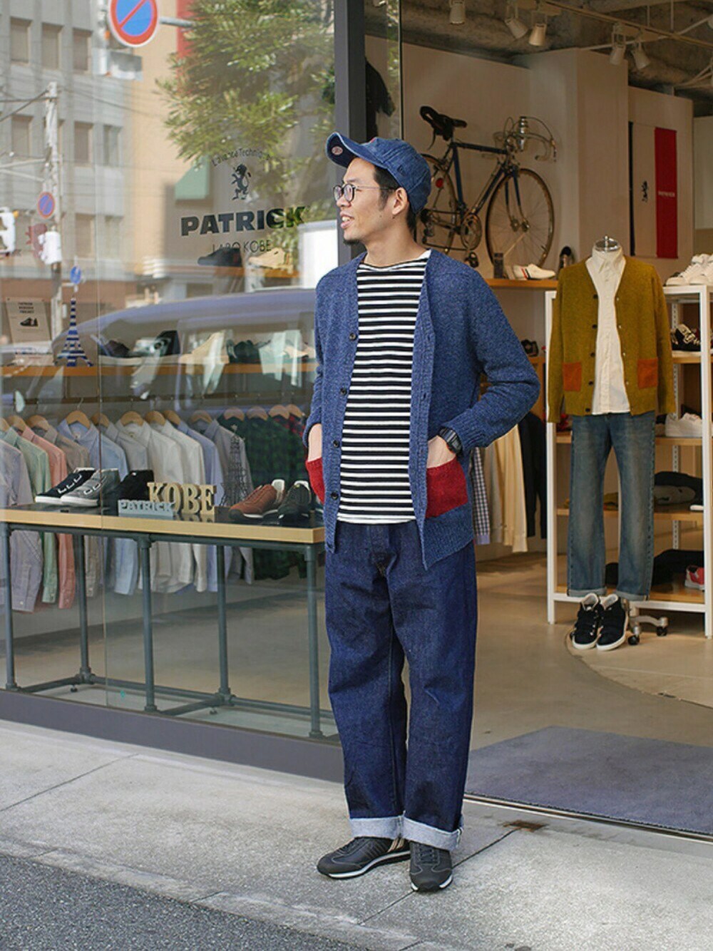 新作ニットカーディガン! ネイビーコーデで合わせてみましたが、 どこかド◯エもんみたいに…( ̄∀ ̄)笑
