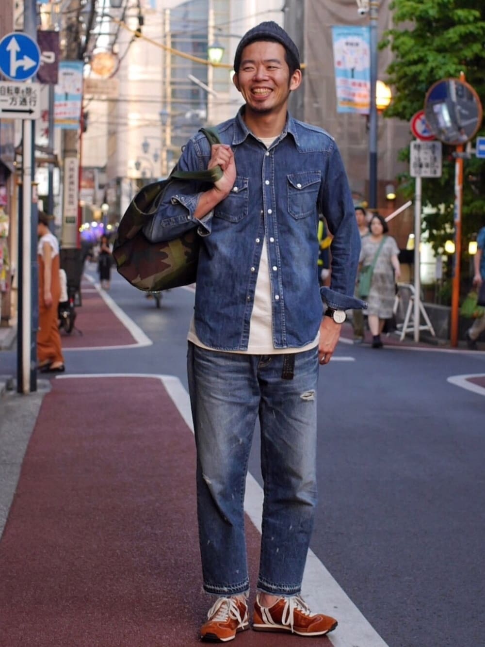 デニムオンデニム😁👖 足元は茶系のレザースニーカー大人っぽく👞