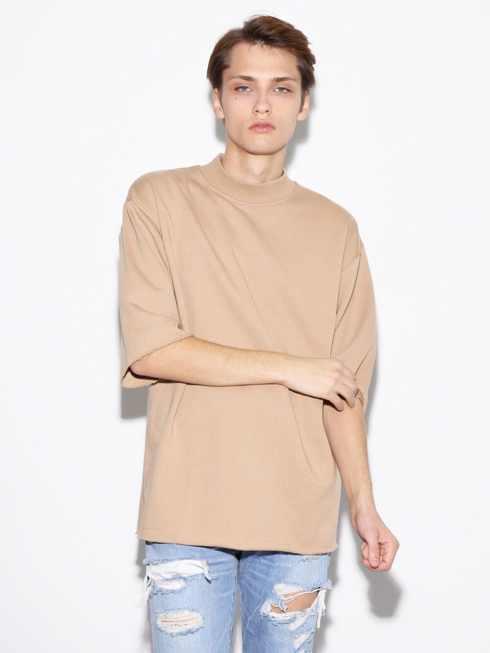 LEGENDA_TOKYOのTシャツ/カットソー「CUT OFF 五分袖モックネックスウェットトップス」を使ったコーディネート