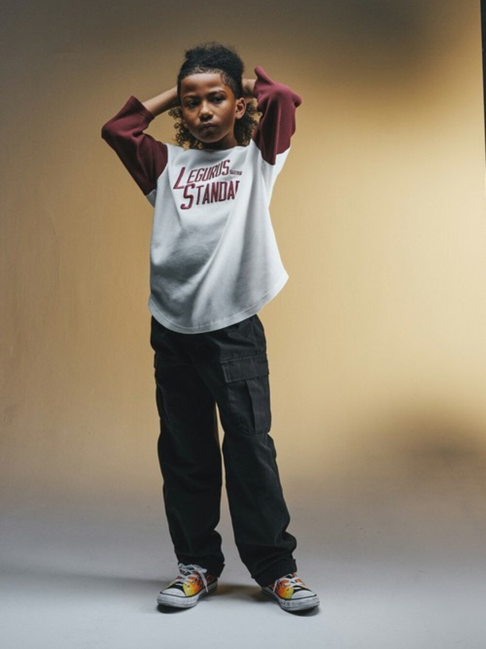 ニューウェーブを起こす次世代のジュニアに向けたファッションブランド『LEGURUS STANDARD』 【ワッフル八分丈Tシャツ】 ワッフル素材に大胆にデザインしたLEGURUSロゴが目を惹く1着。 着丈は少し短めで裾がラウンドしているのでこの一着で様になり、 ボトムスを選ばずコーディネートがしやすいアイテムです★ 袖は8分丈で、袖口はゆったりしているのでラフに着て頂けます!! Sサイズ:135~145cm相当 Mサイズ:145~155cm相当 Lサイズ:155~165cm相当 身長:135.5cm 着用:Sサイズ
