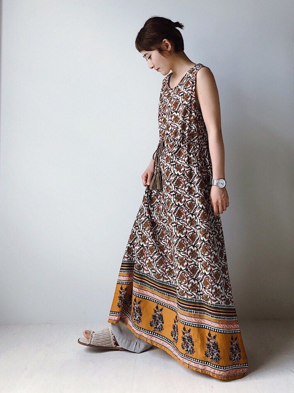 Bou Jeloudのワンピース「Made in INDIA◆オリエンタル柄・パネル柄・リゾート柄ノースリーブリゾートマキシワンピース」を使ったコーディネート