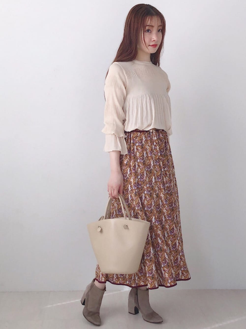 使いやすいオトナな柄スカートに シンプルでも存在感のあるブラウスを。 シーズンレスで使えるブラウスは 今の時期から重宝します! ほどよ〜く透け感があるのが オンナらしさを増してくれて好きです♪ 秋めいたほっこりカラーで先取りコーデです。