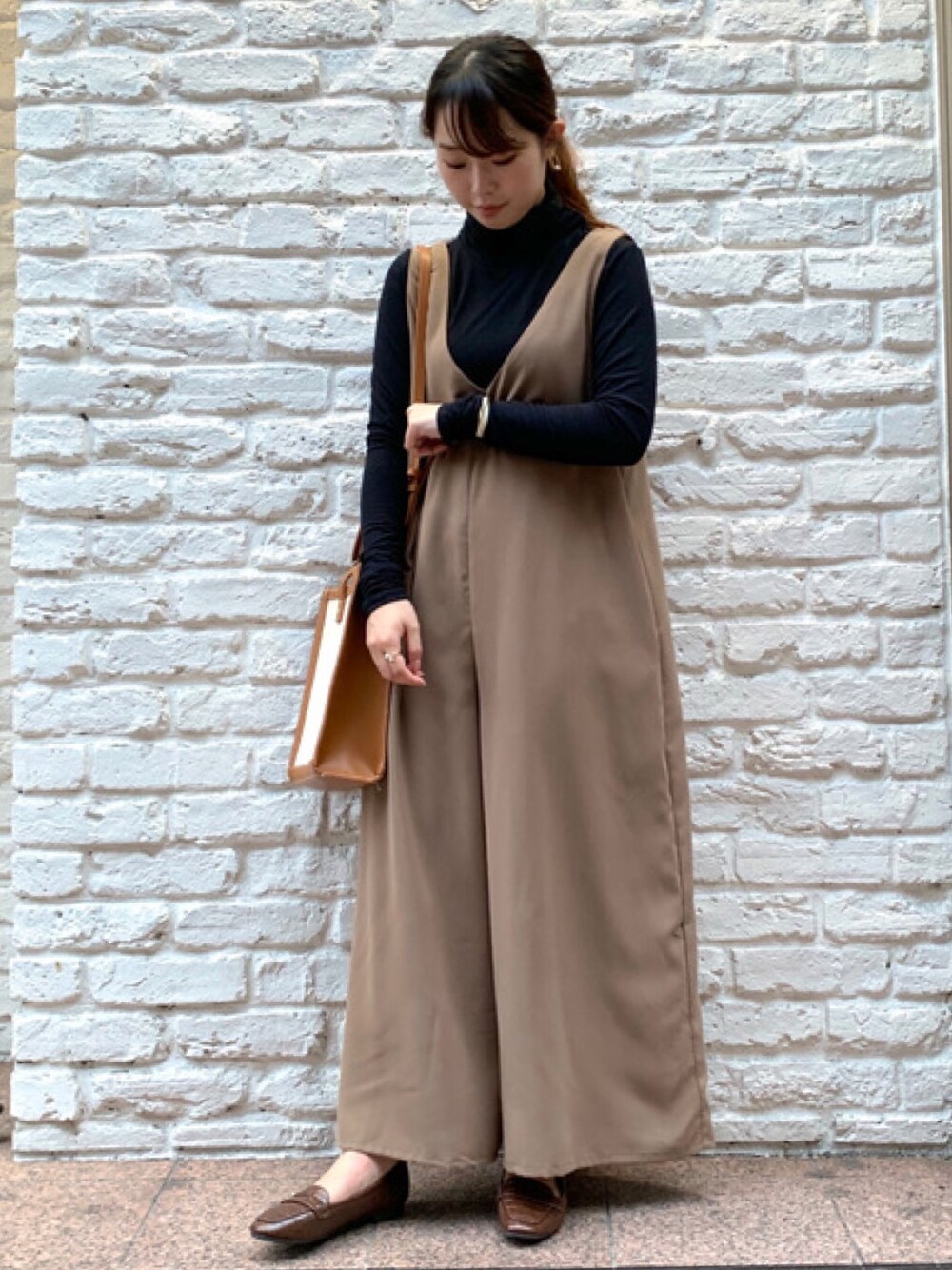 ワイドで深めなデザインがポイントの ロンパースです♪ 全体的にゆるっとしたシルエットなので 脱ぎ着もすごく楽チンで、厚めのニットと合わせても着膨れしにくいのもポイント◎ 黒×ブラウンの組み合わせが秋冬っぽくて 可愛いですよね〜( ´ω` )♡