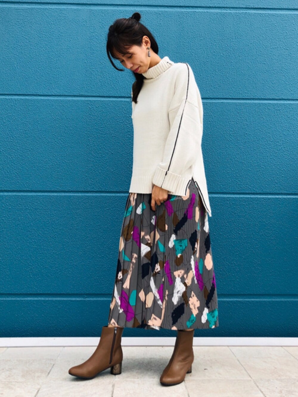 配色ラインがポイントのニット♡ゆったりしたタートルネックで可愛さ暖かさバッチリ! そして今季一推しのスカート✨✨ 柄物ですが意外と合わせやすく 履くだけでめちゃくちゃオシャレになります♪ とってもオススメです\(^^)/