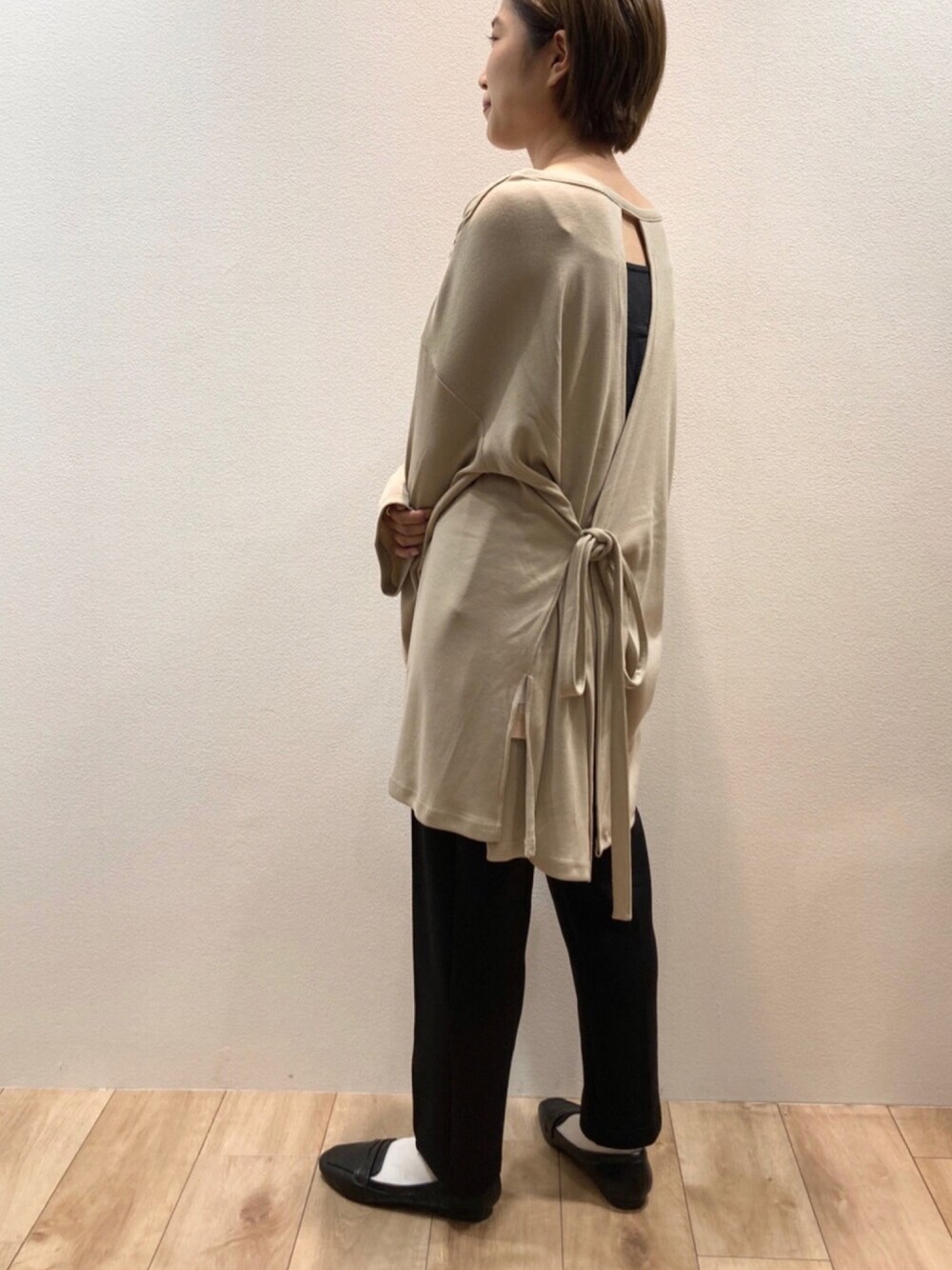 リボンをサイドで結んでゆるっと着る着方と、一周回してアクセントをつける着方の2wayになっています! 丈が長めなので、ロングブーツと合わせてワンピース風に着るのもオススメです!