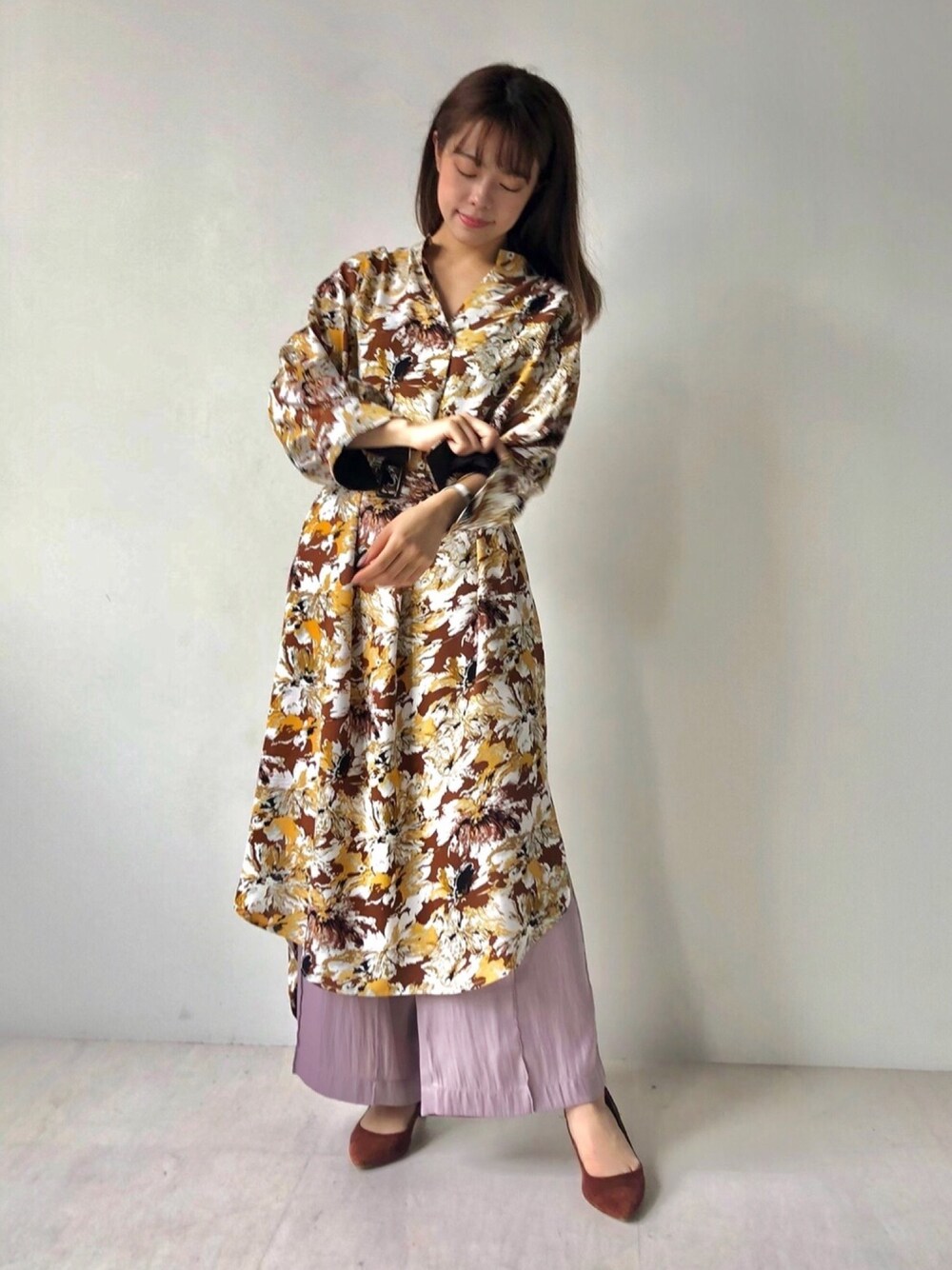柄が目を惹くワンピースはトレンチ風になっておりバックシルエットが綺麗。デニムなどでカジュアルダウンしてもかわいいです