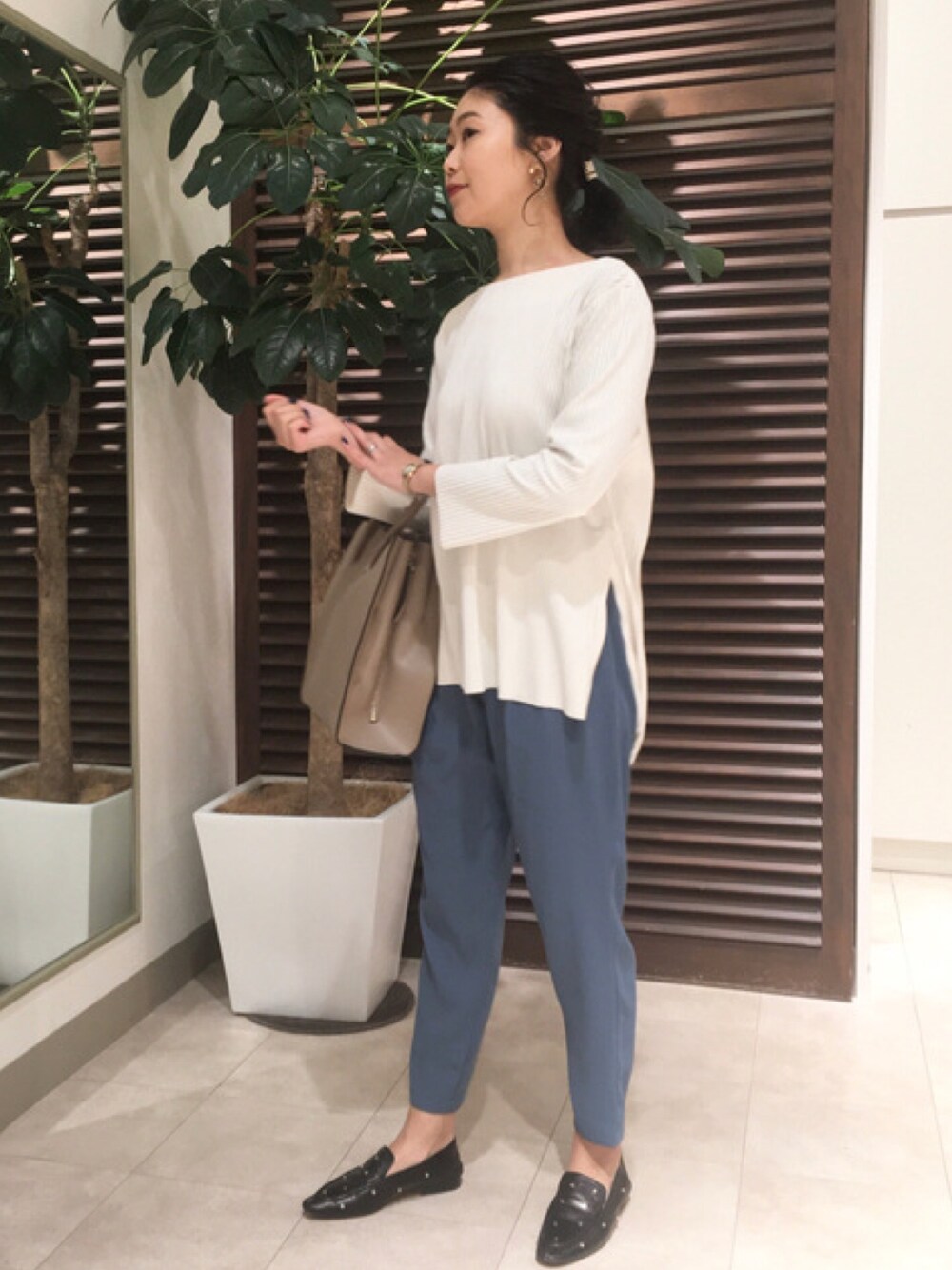 トップスはセットアップにもなるシリーズを着回しています◎ ☑︎パンツ 503433 スリットが深く入りシャツをレイヤードしても◎バックはお尻まで隠れる長さで使いやすい! ウエストマーク出来る紐付きなので綺麗にまとめてスカートなどにも相性良いです。