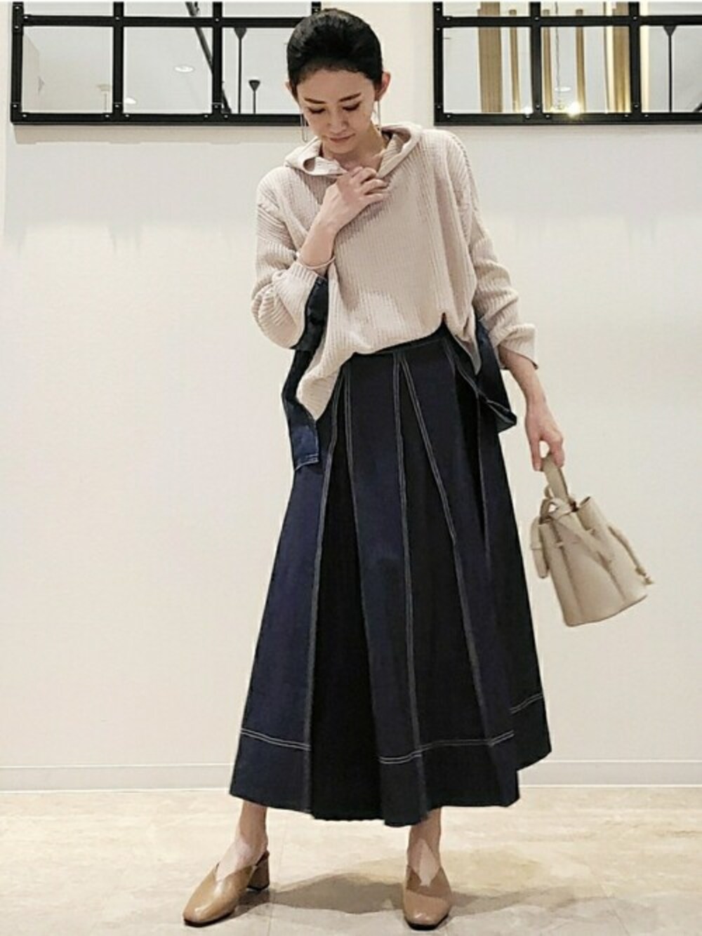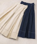 ブージュルードのデニムシリーズはセットアップ風がおすすめ☆ ニットとデニムの相性って、ほんと可愛い♡ ゆったりシルエットも今らしいコーデ。 スカートは動くたびに見えるプリーツが可愛いです!
