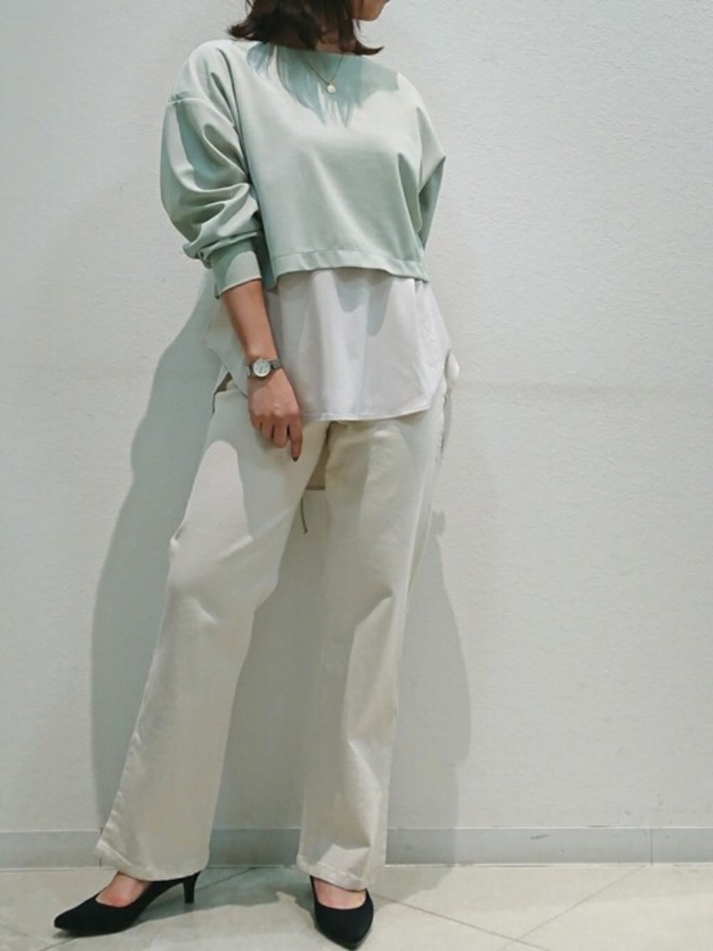 ブージュルードらしいレイヤードトップス。 光沢感のあるストレッチ素材なので、 カジュアル過ぎず大人コーデが楽しめます。 ボトムスは裾がスリットのワイドすぎないパンツなので、 骨格ストレートさんにオススメです♪