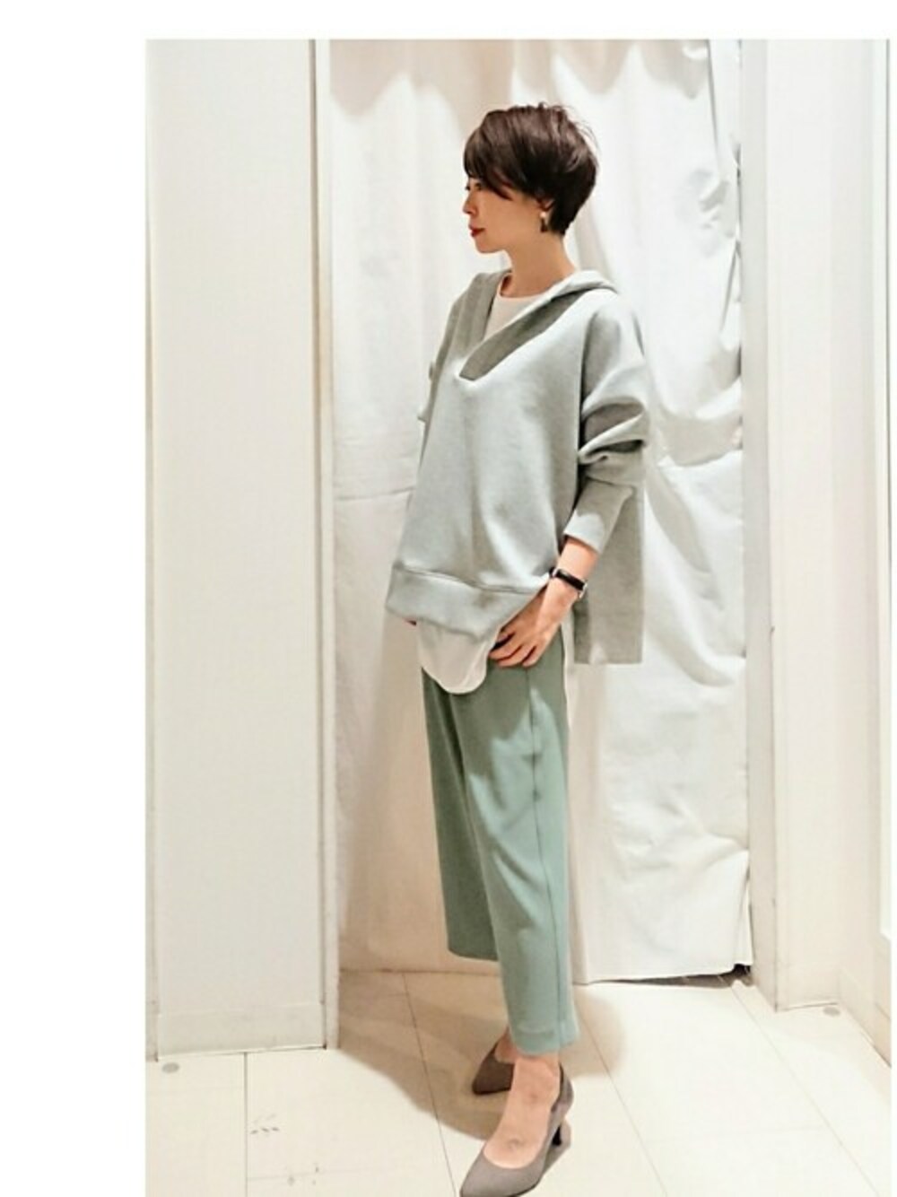 大人カジュアルコーデです。 デザイン性のあるパーカーに綺麗目パンツを合わせました◎