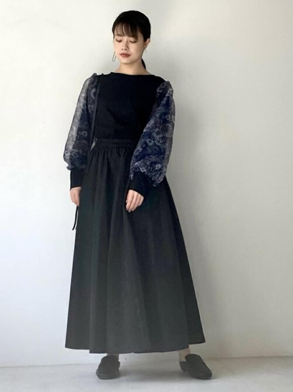 1つ前のコーディネートでこのトップスにデニムを合わせたので雰囲気をガラリと変えてタフタのロングスカートでキレイめに!