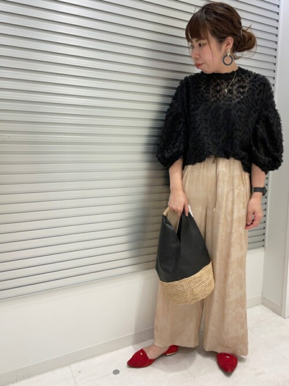 女子会にもピッタリなキレイ見えコーデ。 シアー感がグッと女性らしさをアップさせてくれます! ボトムも軽さ、光沢のあるワイドパンツをチョイスし、リラックス感がありながらもキチっとした、今の時代にピッタリなコーデです!