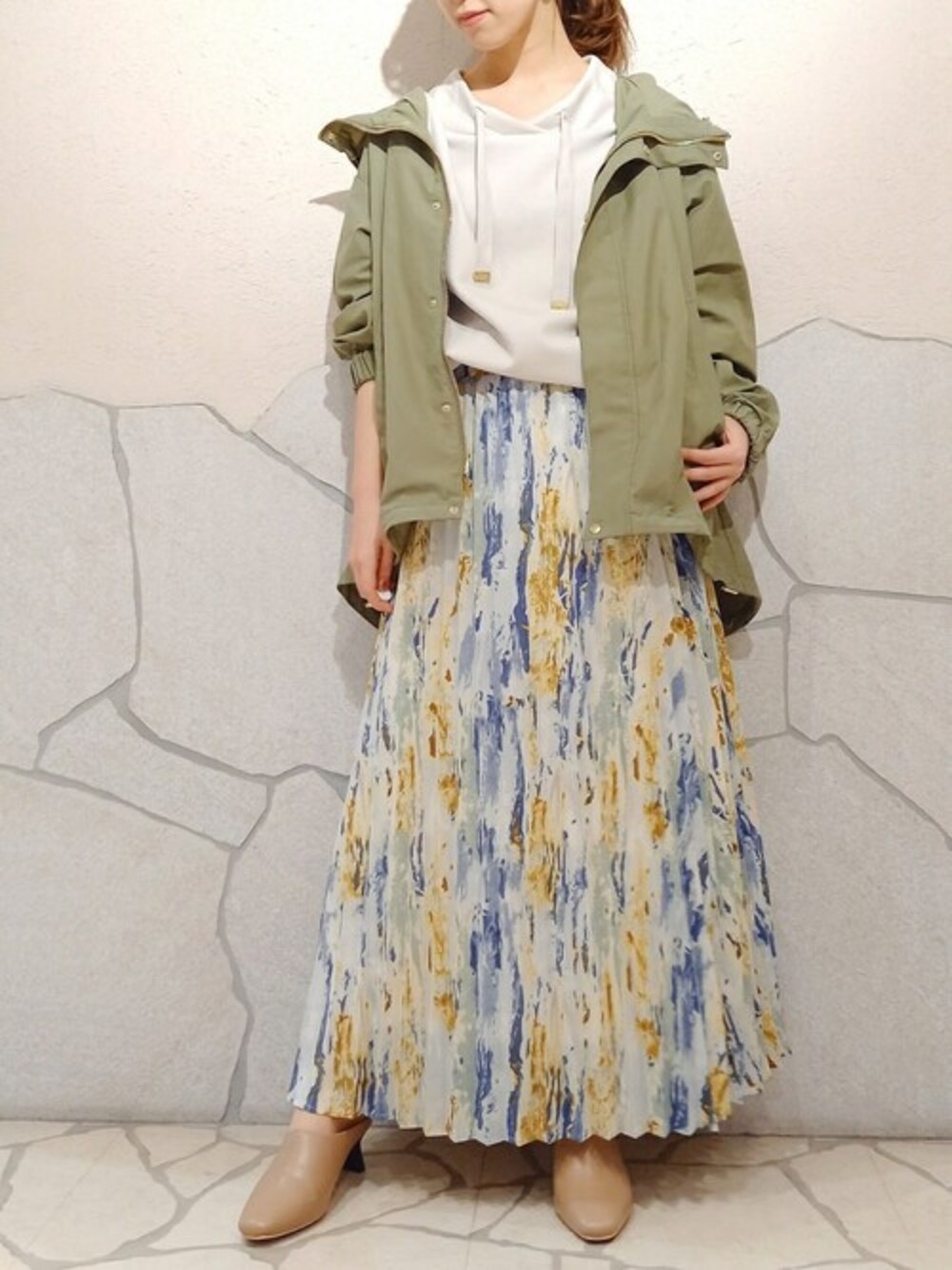 ◆春の定番コーデ マンパー×パーカー×スカートの 定番コーデですが、 スカートの柄と細めプリーツが 女性らしく見せてくれます◎ 色味が華やかですが、 柄自体はそんなに強くないので、 柄苦手、あまり着ない方にもおすすめです✨