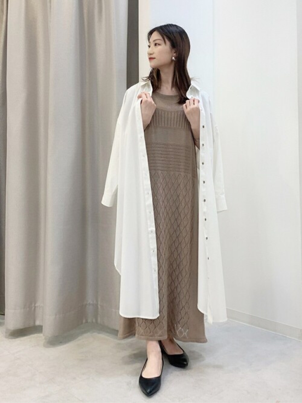 ナチュラル ワンピースコーデ…♡ シンプルなニットワンピース インナー付きなので透ける心配もなく、 リラックスして着ることができる一枚です! 日焼け防止や肌寒いときの羽織にロングシャツを 合わせてみました♪