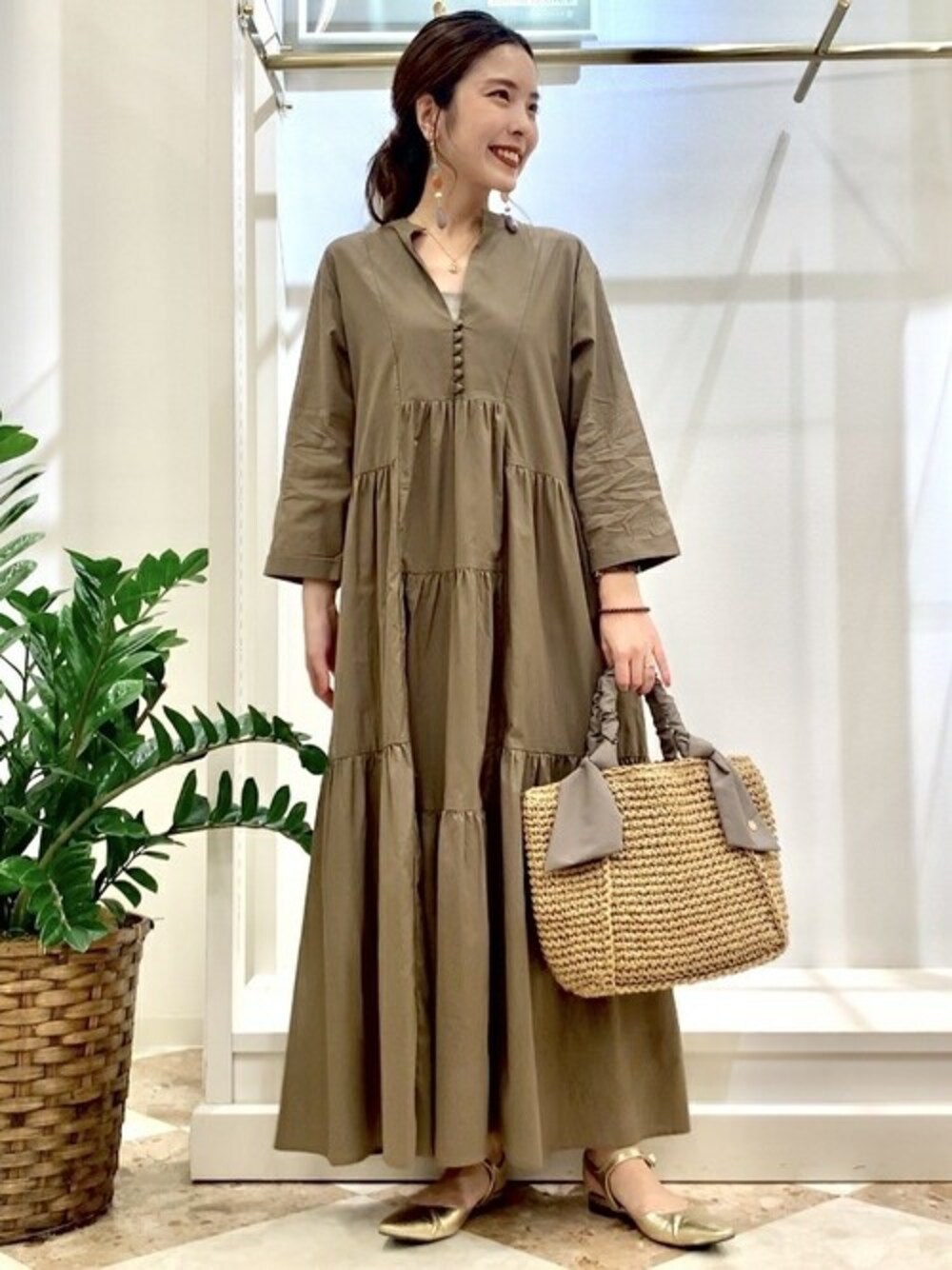 ギャザーの入り方が斬新なティアードワンピースを着てみました! ティアードは甘めなシルエットになりがちですが、こちらは個性的なデザイン&大人っぽいカラーで可愛くなりすぎず、大人っぽくティアードワンピースが着られます! ヘアアレンジをポニーテールにして、ヘルシーに着るのもオススメです! アクセサリーやバッグやシューズで変化をつけて楽しみつつ、ワンピースを主役に1枚で着たい1着ですね!