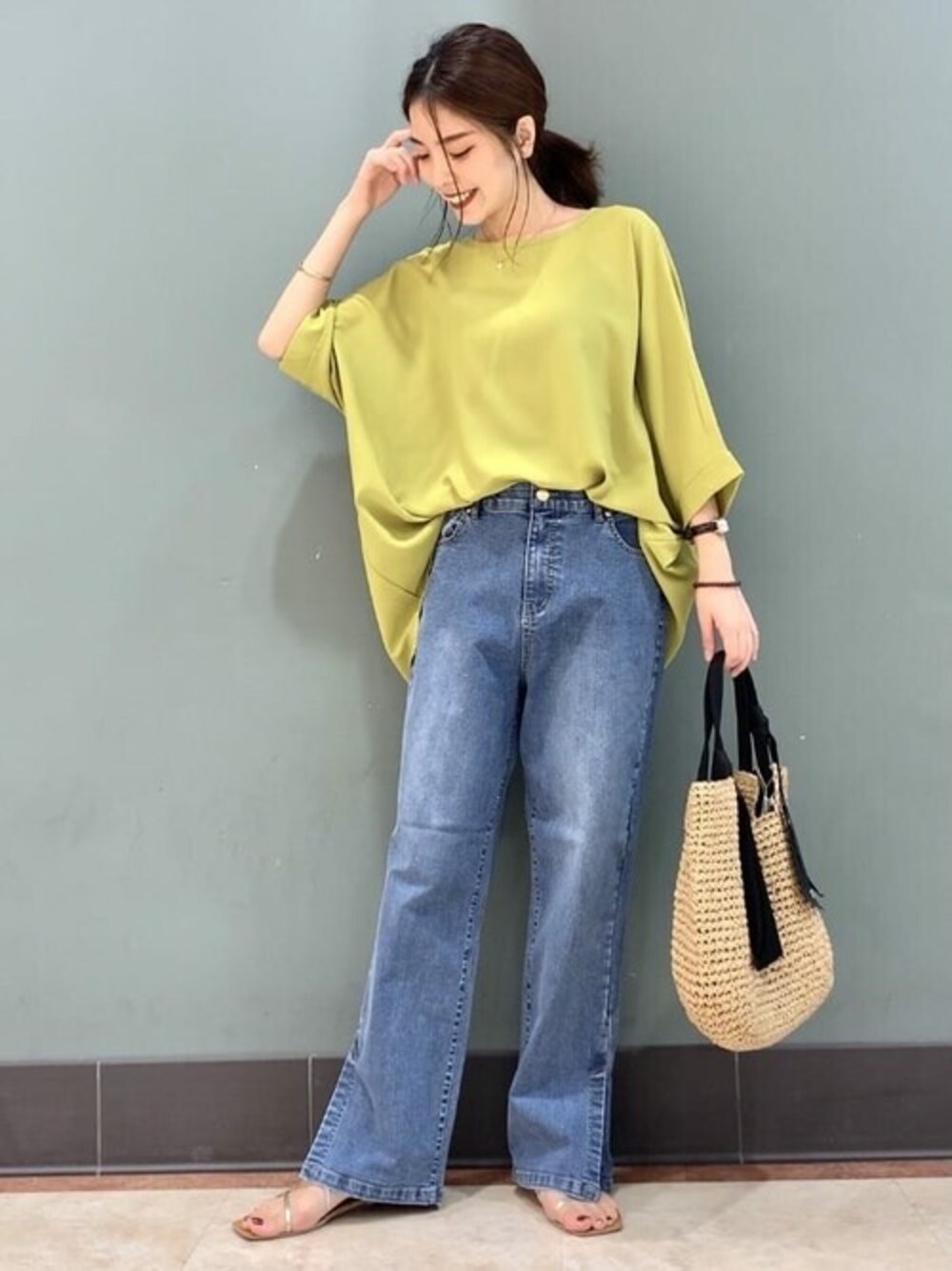 チュニックブラウスにデニムパンツを合わせた大人カジュアルコーディネートです! こちらのチュニックは、ゆったりなドルマンスリーブと程よい丈感で、着心地とシルエット共に◎です…!!! 肌触りも良く、ごわつきの無い柔らかい生地感も◎です! カラーも鮮やかで、見た目にも夏らしく涼しいですね!! キレイめコーディネートにもカジュアルコーディネートにも馴染む幅広い着回し力も嬉しいポイントです! 今回は、デニムパンツでカジュアルにしてみました! 裾にスリットの入っているトレンド感あるデニムパンツです! 全体にストレッチが効いていて、履き心地も抜群です!!
