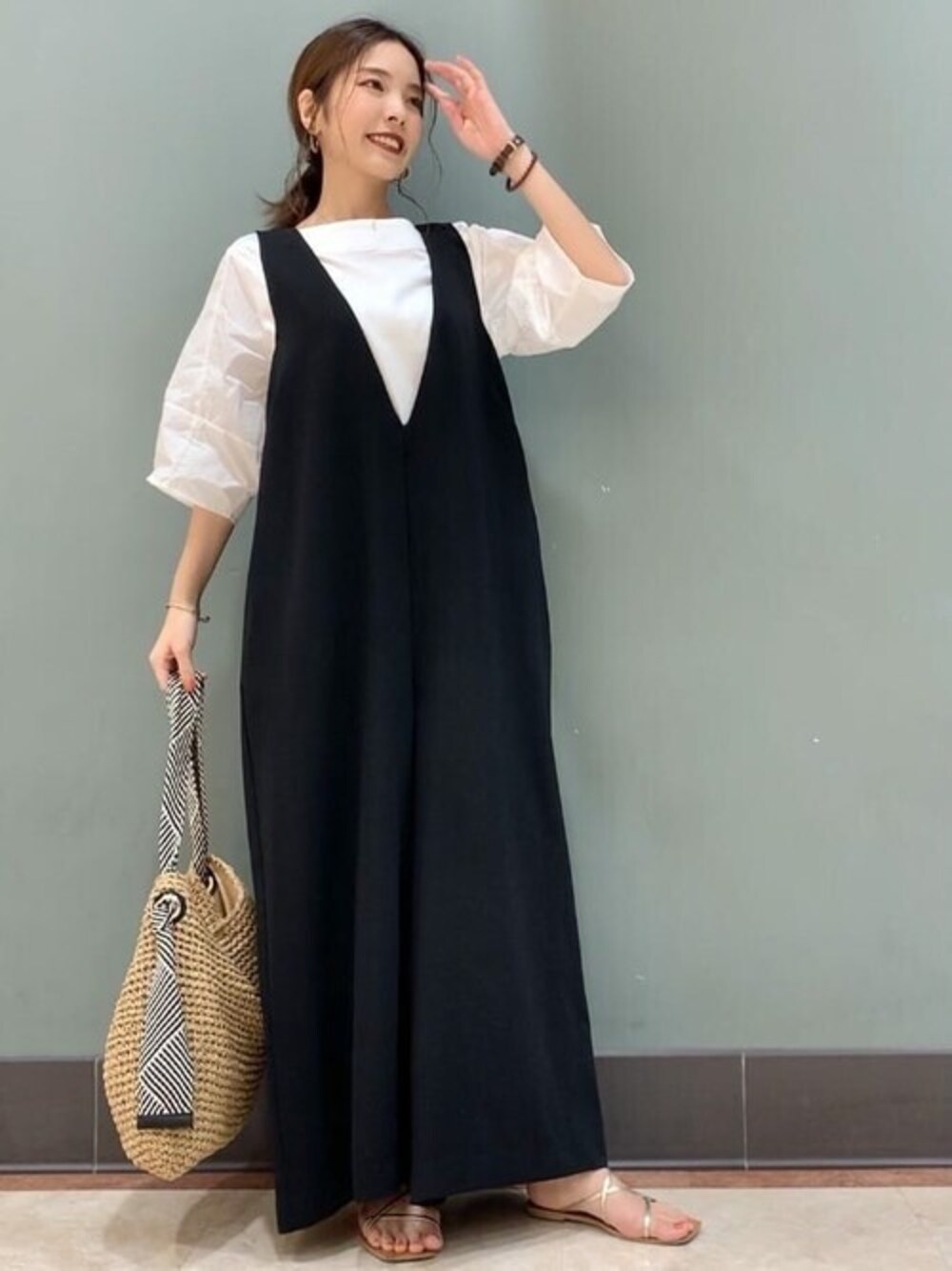 今季大注目の袖コンシャスなトップスに、深Vネックなオールインワンを合わせた大人モノトーンコーディネートです! こちらのトップスは、袖部分と本体部分が異素材になっていて、袖部分は今年トレンドになっているシアー感のある素材です! ほんのりと透け感があって、袖にボリュームがあっても見た目に涼しさがあります!! 着心地も、肌触りが良く◎です! 合わせたオールインワンは、私のお気に入りのオールインワンです!(私は色違いで持っています…!!) ベルトも付いており、雰囲気を変えて楽しめます! 生地感は柔らかくしっかりしていてカジュアルすぎないので、セミフォーマルなシーンからデイリーカジュアルまで、幅広くマッチしてくれる万能オールインワンです!!!