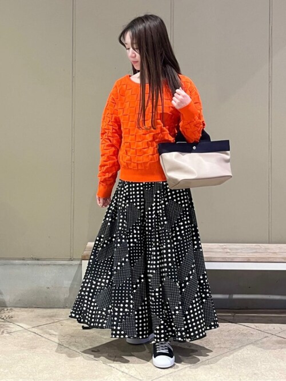 明るいオレンジが目を惹くトップスです。 とても軽い素材で春先まで使えます◎ パンツはスカートのような見た目です。 ウエストゴムでストレスフリー♪ 夏に好評だったストレッチ性抜群のスニーカーです。紐を結ばなくて良いため着脱ラクラクです!