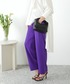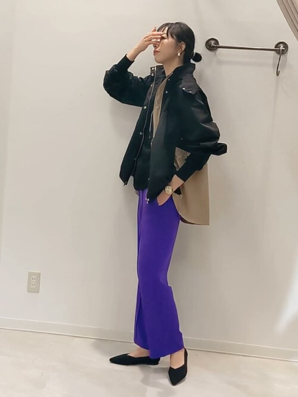 鮮やかなパープルが目を引くセンターシームワイドパンツです。 ブラックとパープルで、メリハリコーディネートです。 さりげなくエンボス加工でロゴプリントされているトップスをインナーでいれております。