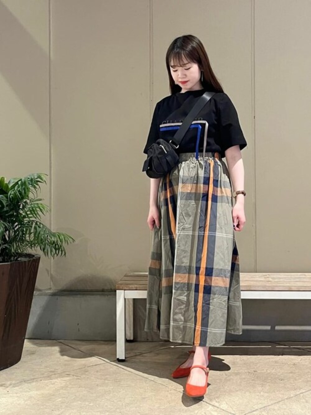 Tシャツはカジュアルにもフェミニンにも使える万能アイテムです。 袖は長めです♪ スカートはオレンジが差し色になるチェック柄で春夏らしい雰囲気に◎ ショルダーバッグはポケットも付いており、ご旅行やお出かけ時に活躍すること間違いなしです! ブラックもアイボリーもコーディネートに馴染みやすく使いやすい♪