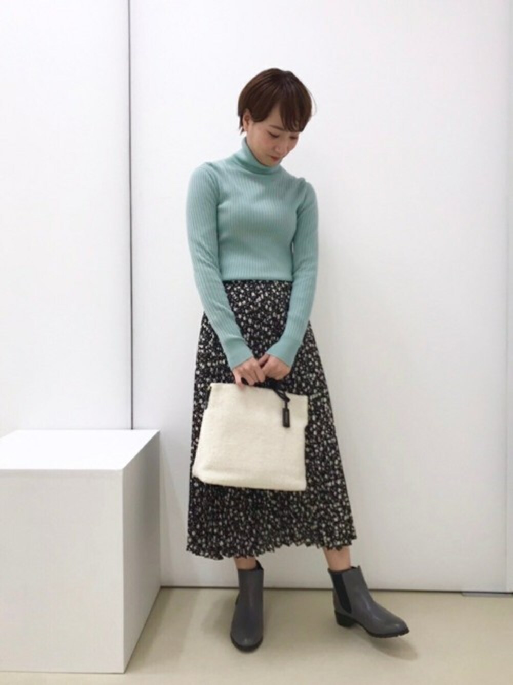 人気のプリーツスカートを使ったコーディネートです! 動く度にニュアンスの出るスカートは上品見えし、大人っぽく着こなせます。 また、トレンドカラーのニットは1枚で今年らしいスタイルを叶えます。