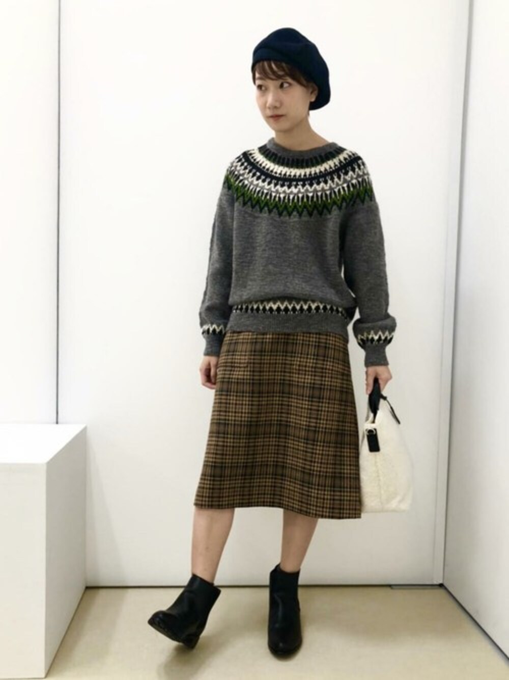 求心柄ニットにチェックスカートを合わせてトラッドでフェミニンなスタイルにしてみました☆チェックスカートは意外にもなんにでも合わせやすい万能アイテムです!