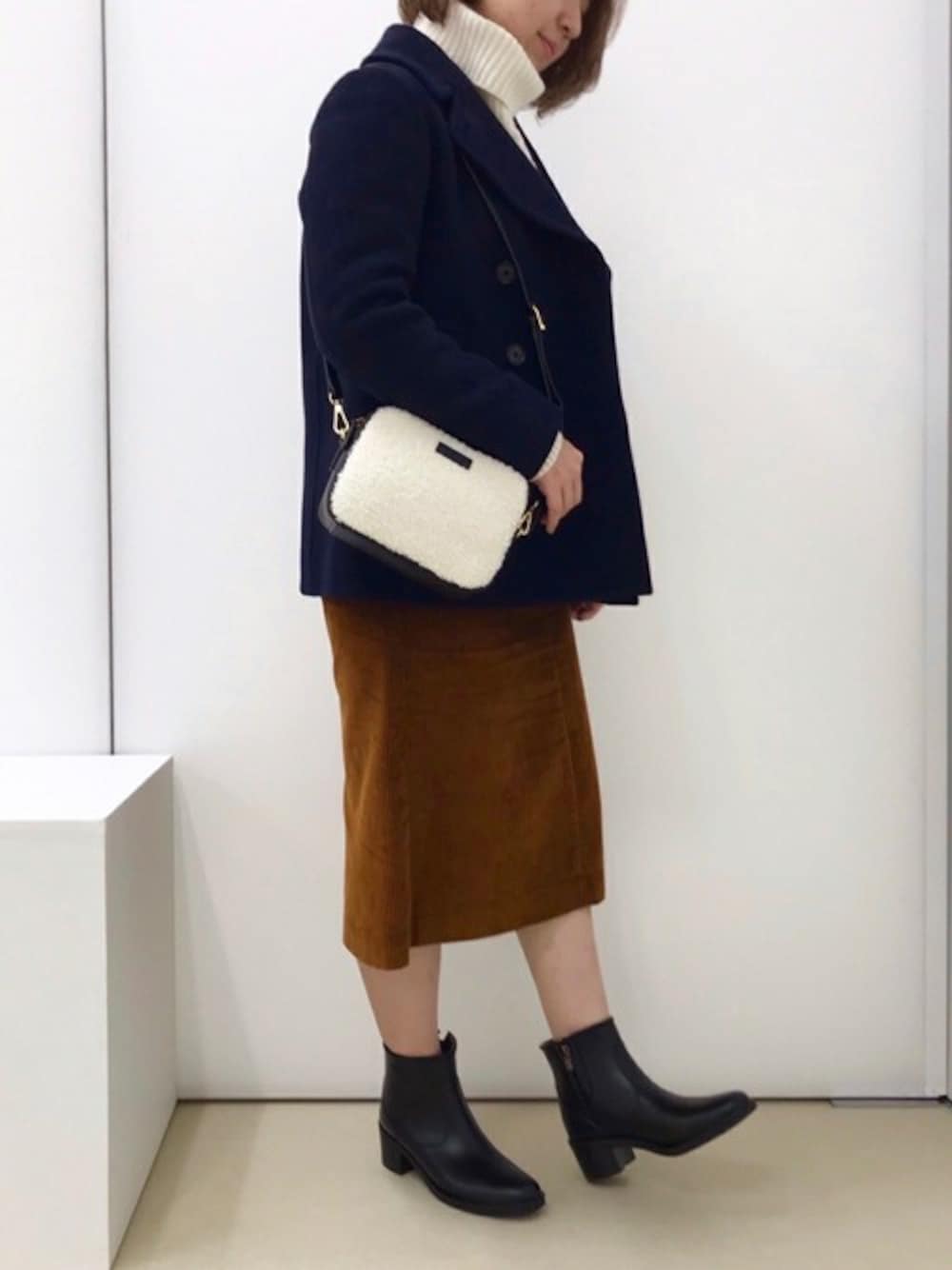 通勤からカジュアルまで対応できる、万能なPコートに、 首もとゆったりめなハイネックニットを合わせたベーシックコーデ。 程よいゆったり感のニットは顔をうずめたくなるほど温かく、 コートを脱いでも存在感抜群です!