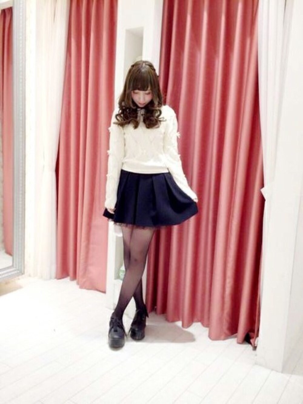 トップスにほどこされたリボンが一気にガーリーな雰囲気を叶えてくれます・・・♪ ボトムスは落ち着きのあるキレイめシンプルなタックスカートを合わせて甘過ぎない、バランスの取れたスタイルの完成です。
