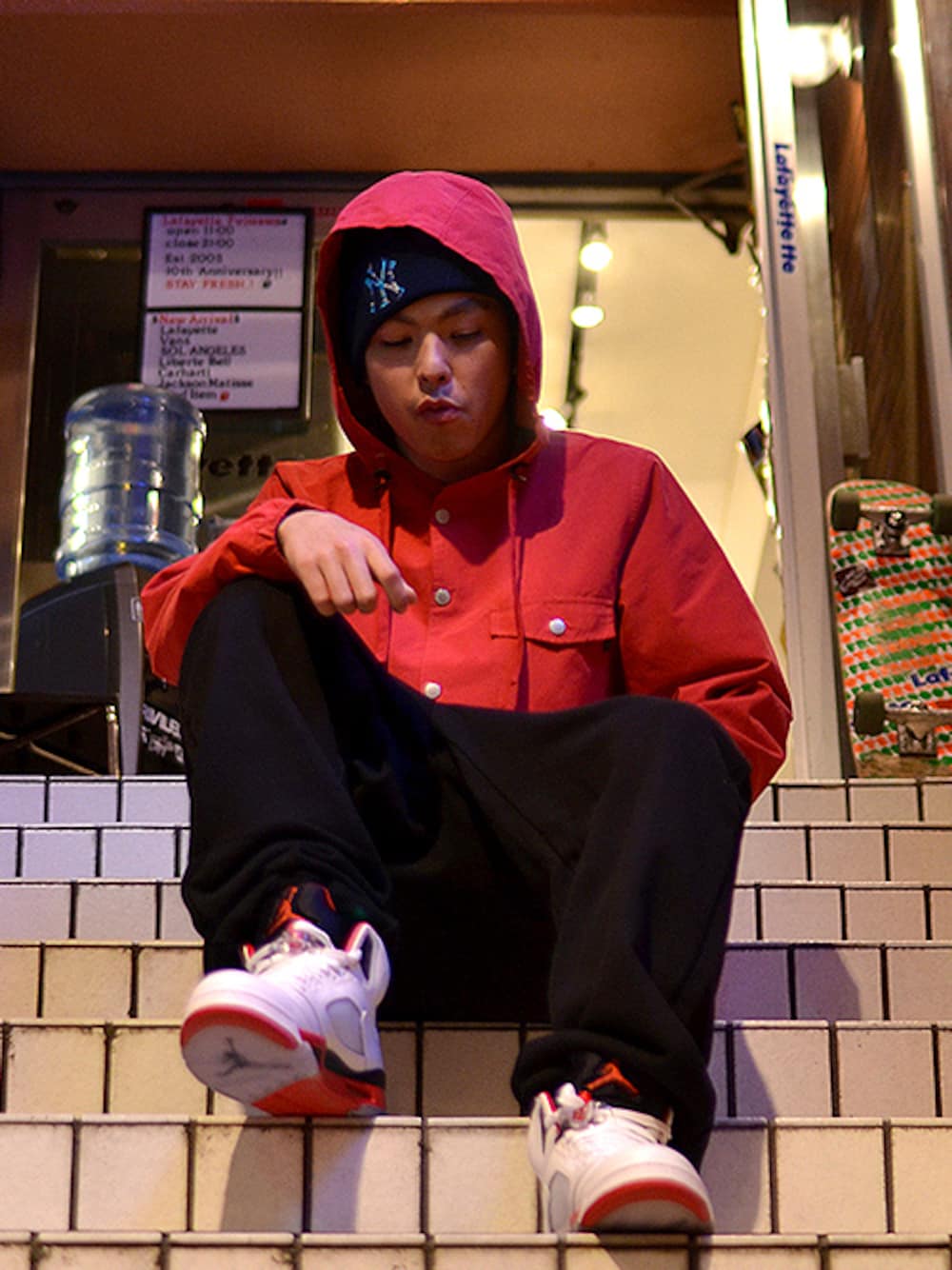 model : in-d Cap: Lafayette / ×STASH SPLATTER YANKEES NEW ERA CUFF KNIT Jacket: Lafayette / HOODED COACH JACKET / Size:L Pants: Liberte Bell / Washed Sweat Pants / Size:L Shoes: AIR JORDAN 5 RETRO http://zozo.jp/brand/lafayette/ http://www.lafayettecrew.com/